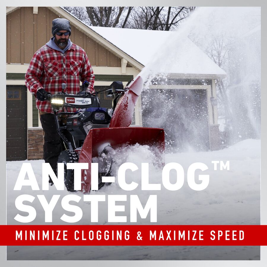 Winter is no match for the Toro 60v Power Max® e26 two-stage snow blower. Tackle years of tough jobs with confidence thanks to steel construction in the housing, frame, deflector and chute. We combine Toro toughness with 3 battery ports, this is the toughest, meanest, most powerful battery-powered snow blower on the market that blows through even deep snow, with a 26-inch-wide clearing width and 20-inch intake height. The innovative Quick Stick control allows you to quickly and easily change steel chute direction and chute deflector with a single, smooth motion. Convenient one-hand operation levers allow single-handed operation, freeing the other hand to change speeds or the chute control without stopping. The self-propelled automatic steering offers smooth, tight turning – no triggers or levers required. Toro’s exclusive Anti-Clogging System measures snow intake to reduce clogging and maximize clearing efficiency. Toro uses bolts that are 2x stronger than the competition’s shear pins. The blower is also equipped with Hardened Gears™ in your auger gearbox – no shear pins to replace.